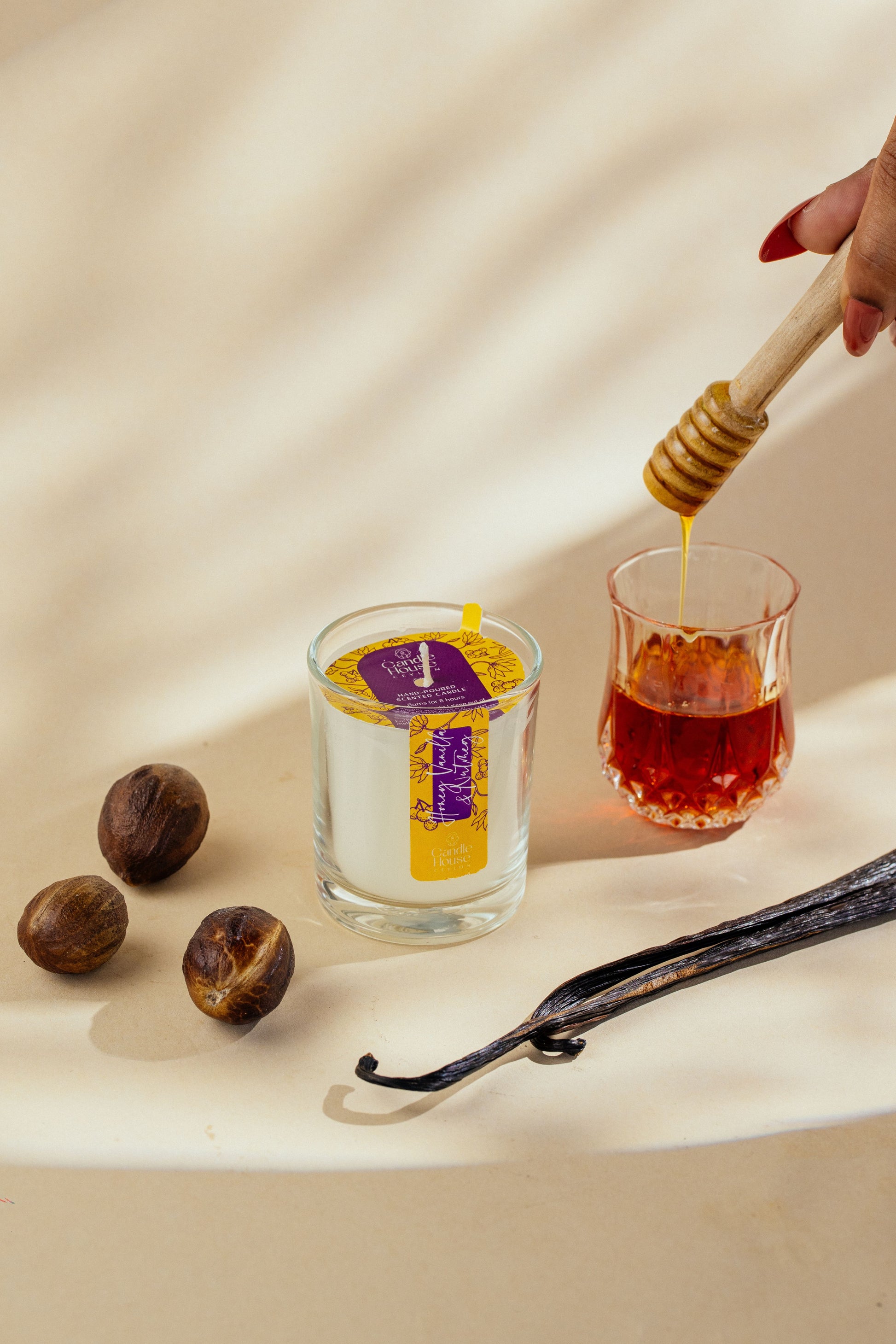 Honey, Vanilla and Nutmeg scented mini glass candle.